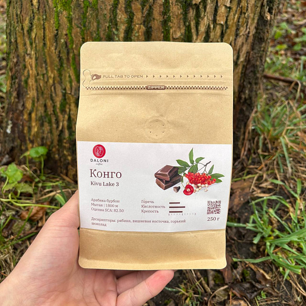 Кофе из региона Киву — лот, в котором гармонично сочетаются терпкие ягодно-фруктовые ноты рябины и вишневой косточки и шоколадная сладость. Также вы можете почувствовать ноты темных ягод и винограда.